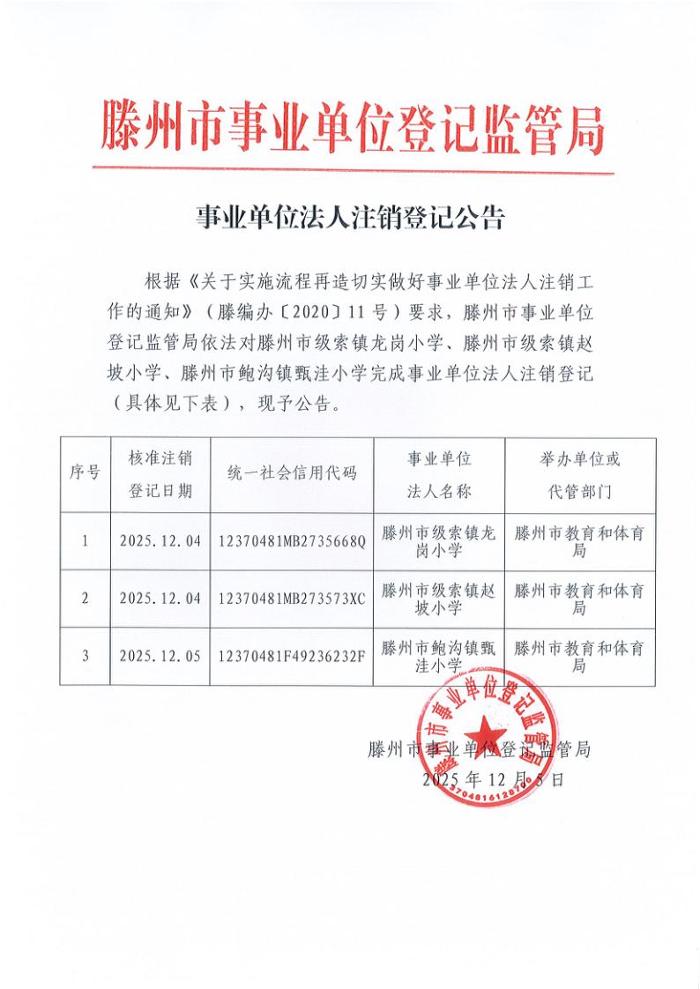 滕州市事业单位登记监管局依法对滕州市级索镇龙岗小学、滕州市级索镇赵坡小学、滕州市鲍沟镇甄洼小学完成事业单位法人注销登记公告
